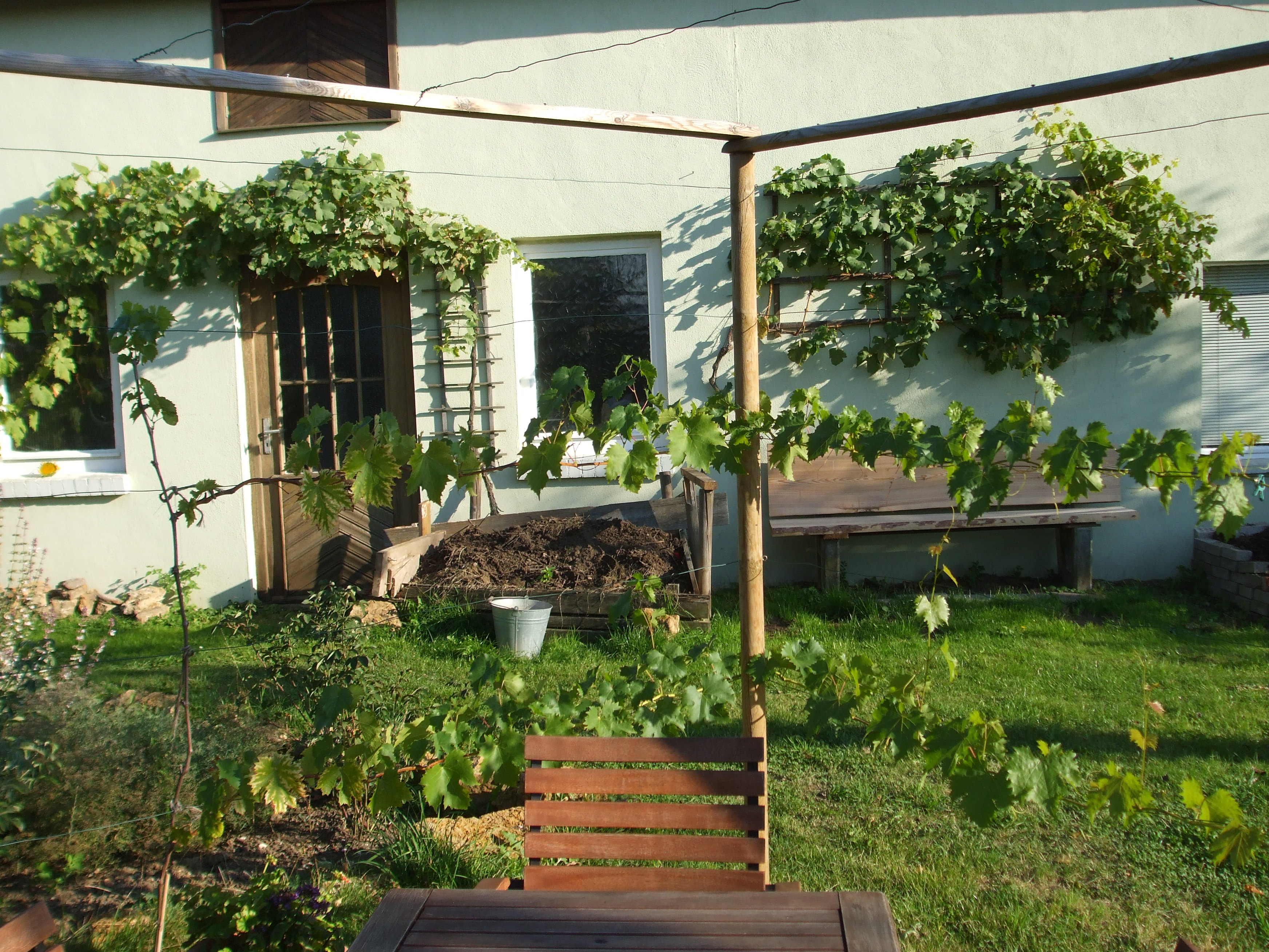 Rebstock im Garten – Richtung Westen. Der Stock wucherte in 2011 in ca. 220 m Höhe entlang des Hauses. Er hatte bislang im Schatten der Reine-Claude gestanden. Jetzt mit voller Sonne trieb er gut aus. In 2012 wurde er am Haus entlang auf ein Spalier geleitet.