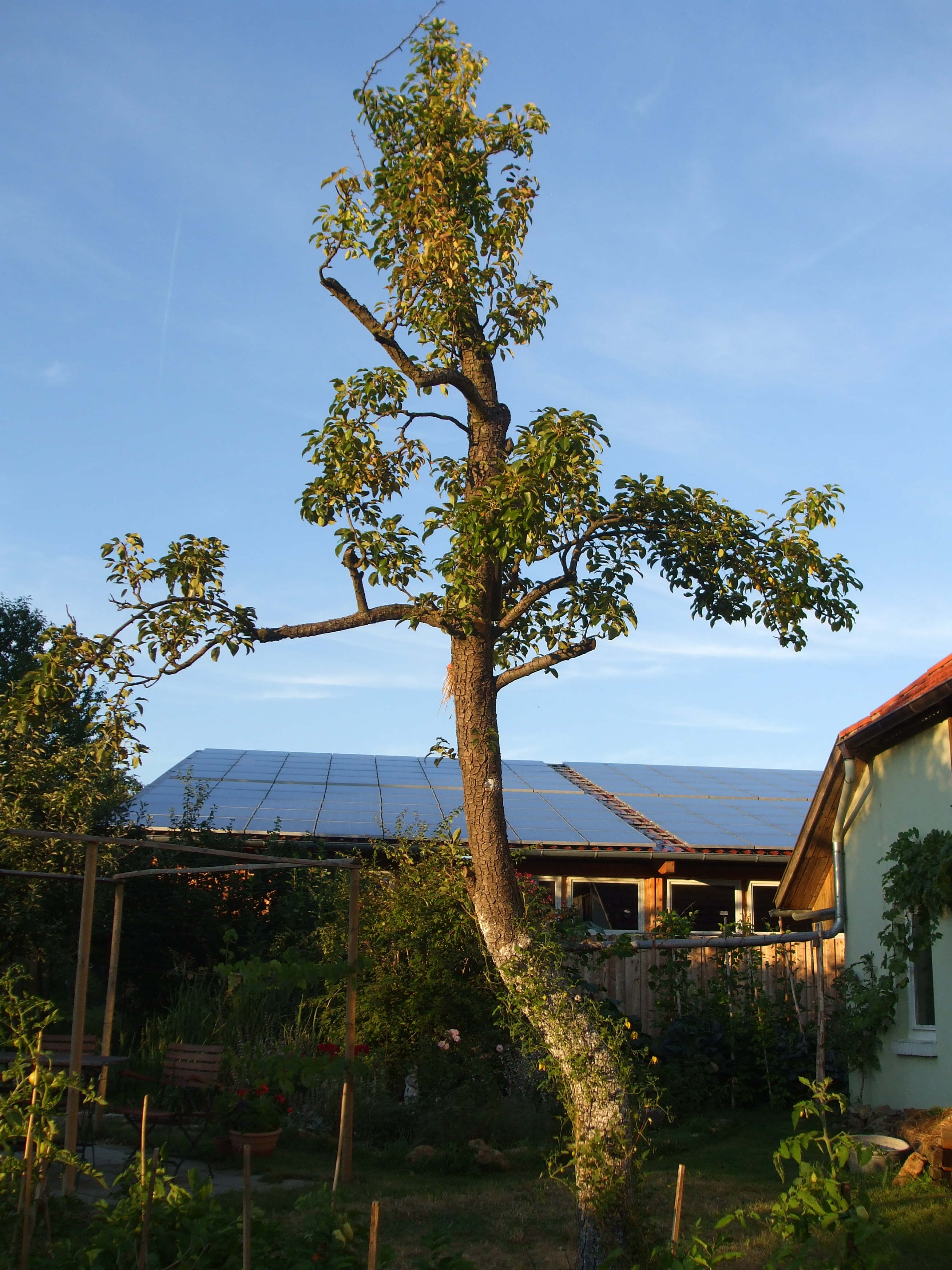 Der alte Birnbaum trug nur noch wenig Laub und hatte mehrere abgestorbene Äste. Im Herbst 2012 begannen wir die Birne reichlich zu wässern. Im Frühjahr hatten wir frischen Mist auf die Baumscheibe gehäufelt. Im Winter 2012 wurde Holzasche von der Befeuerung des Kachelofens auf die Baumscheibe ausgebracht. Gegen Schädlingsinsekten haben wir im Dezember auch einen Leimring um den Stamm aufgebracht. Der Baum trug in 2011 nur 2 Birnen, in 2012 6 Birnen, die uns gut schmeckten. In 2012 pflanzten wir eine gelbe Clematis an ihren Fuß, nachdem eine Kletterrose dort eingegangen war.
