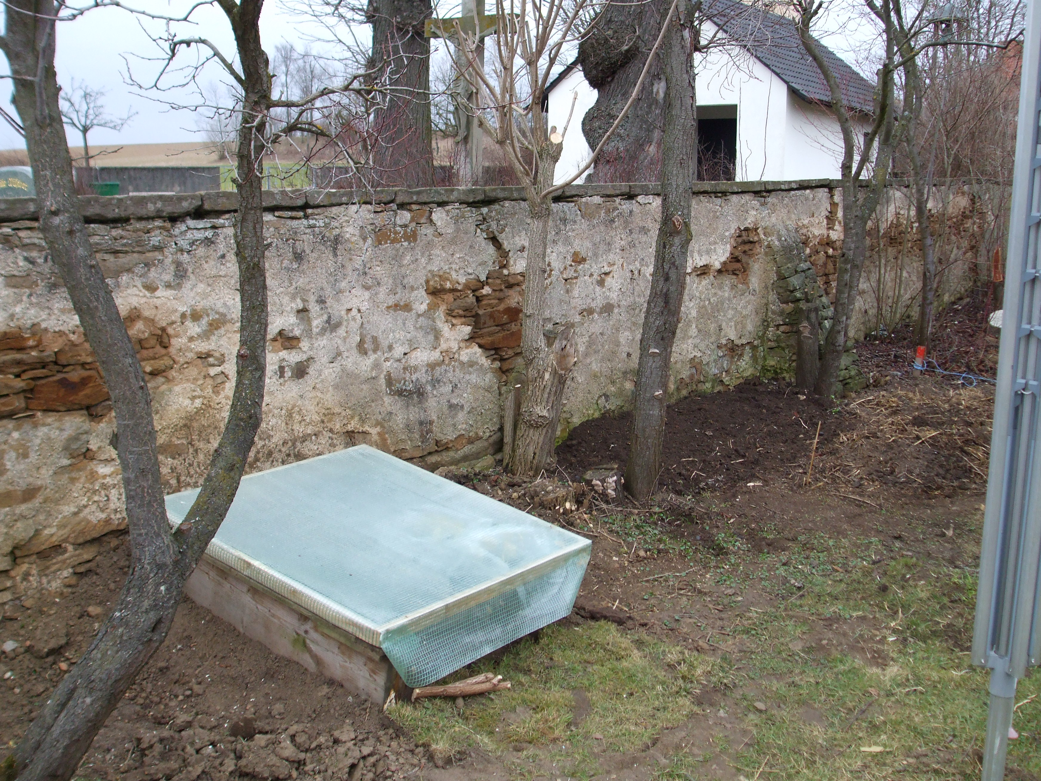 Heute haben wir unser Frühbeet aufgestellt. Von Morgensonne beschienen, von einer Sandsteinmauer geschützt. Wir haben ein 70 cm tiefes Loch gegraben, mit Pferdemist und einer Schicht Gartenerde befüllt. Ausgedienter Sandkasten mit einem mit Folien bespannten Rahmen als Deckel. Im letzten Jahr haben wir schon gute Erfahrungen gemacht: bei frostigen Temperaturen herrschten im Frühbeet angenehme Temperaturen. Tagsüber geöffnet und nachts wieder geschlossen, entwickelten sich die Tomaten, Auberginen, Paprika, Zucchini und Kürbis wunderbar! Als die Pflänzchen später ihren angedachten Platz einnahmen, war das Frühbeet frei und wir haben hier eine kletternde Zucchini „Black Forest“ wachsen lassen.