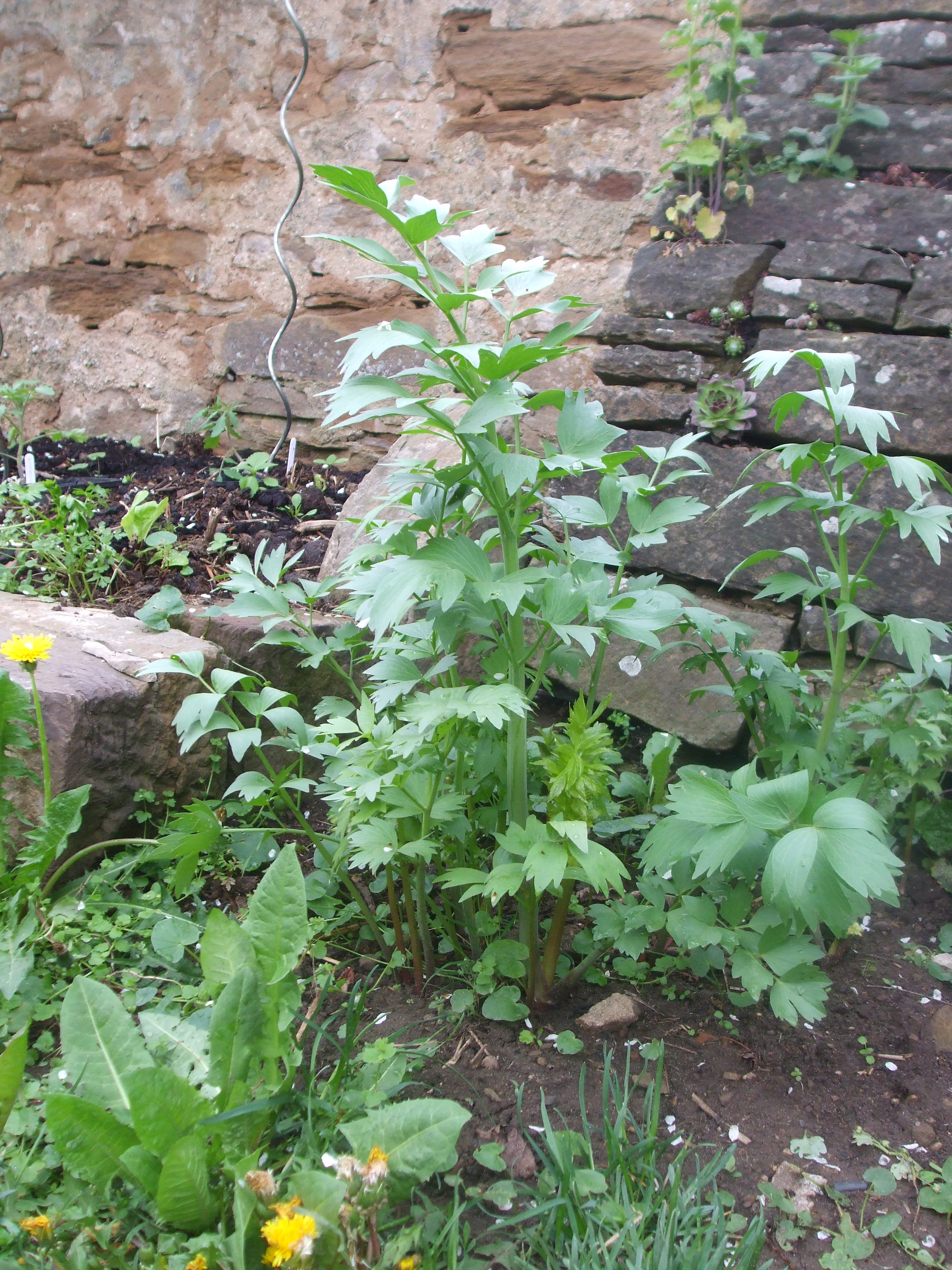 LiebstöckelDer Liebstöckel hat sein eigenes Reich, da er sehr üppig wächst und mehr Nährstoffe braucht. Alle paar Jahre darf er geteilt werden, das fördert das Wachstum.