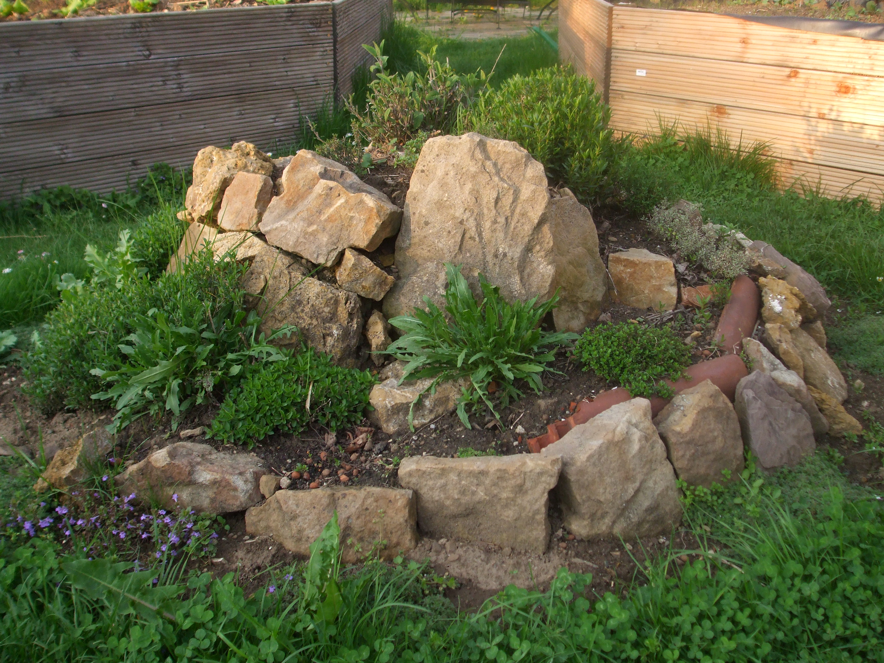 KräuterspiraleUnsere Kräuterspirale ist aus Sandsteinen und Tonscherben (alte Dachziegel) gebaut. Hier haben wir nur Kräuter, die Wärme und einen nicht so fetten Boden lieben. Es tummeln sich hier Insekten aller Art.