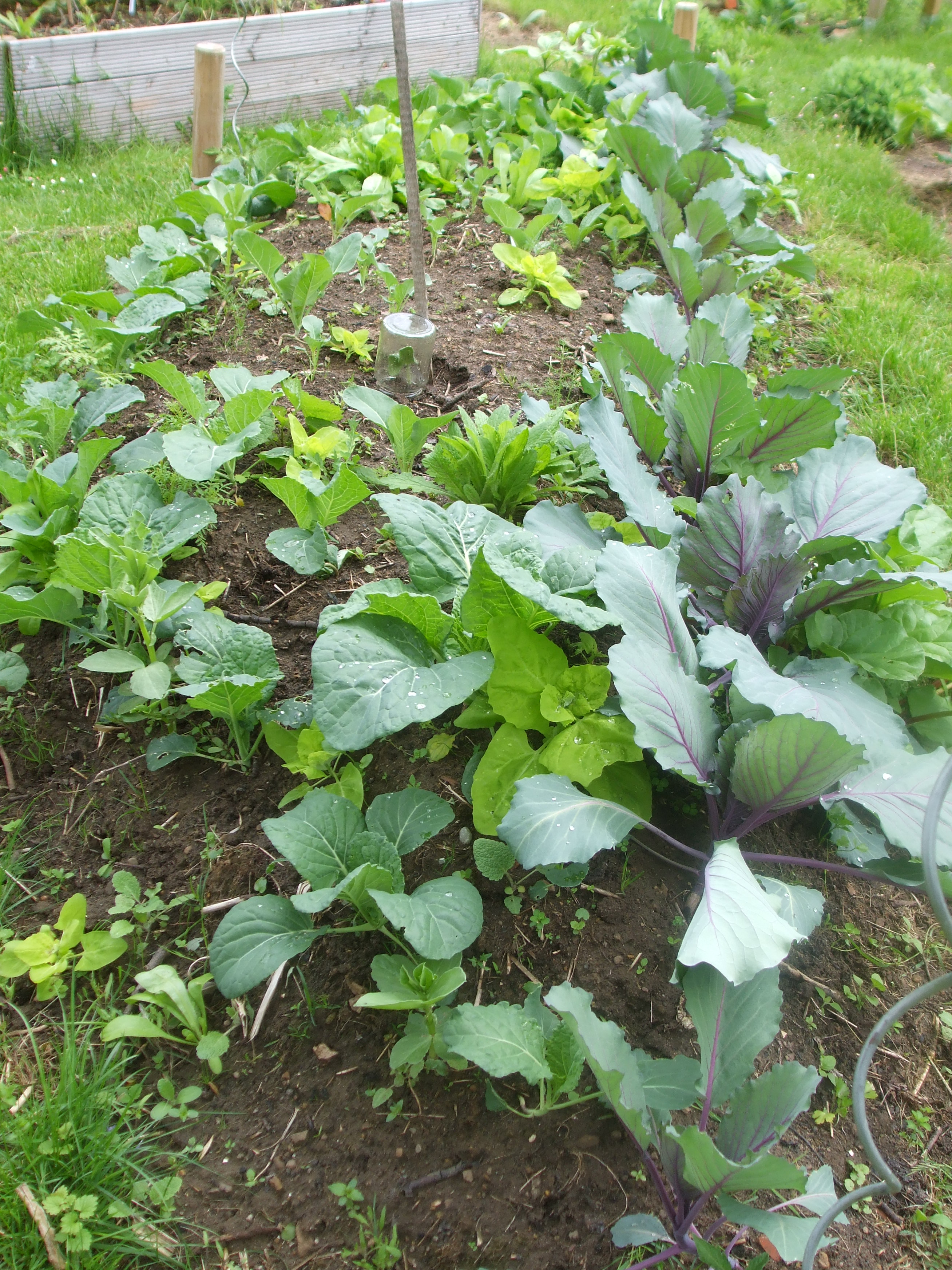 Das Hügelbeet mit Kohlpflanzen aller Art – und mittendrin mein Lieblingskürbis Muscat de Provence, geschützt durch ein Glas wegen der Kälte. Wer genau hinsieht, entdeckt auch hier und da die „Gelbe Gartenmelde“.