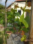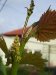 Die Gescheine schlummern in den Augen der neuen Triebe. Sie wachsen am einjährigen Holz und beginnen bald zu blühen. Die Rebe soll in der Kordon-Wuchsform an der Laube erzogen werden.