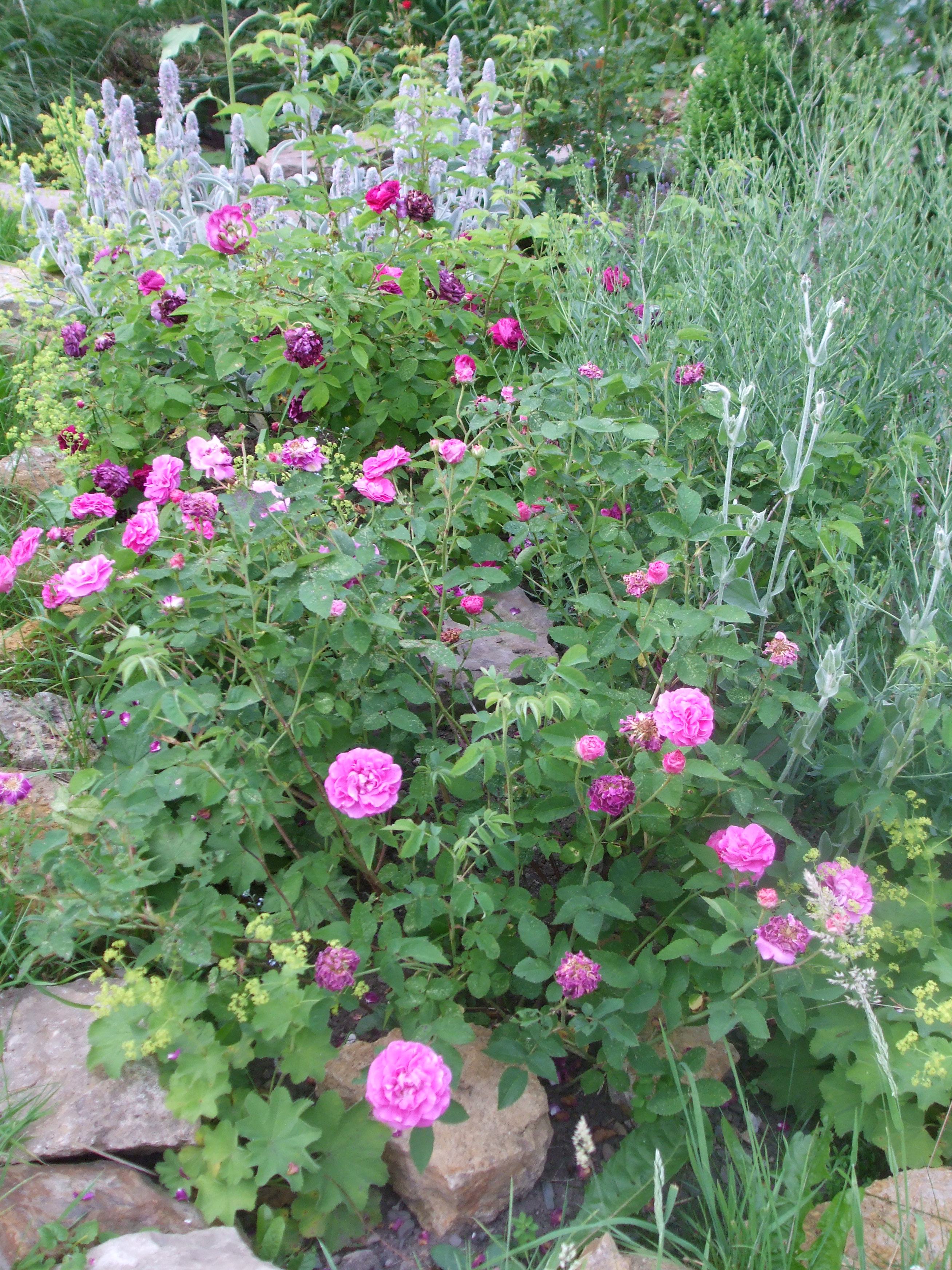 Wir haben vor unserem Sitzplatz, der umrankten Gartenlaube, rechts und links zwei historische Duftrosen gesetzt. Hinter dem Freisitz liegt unser Duftrosenbeet mit den Zentifolien – also keine Chance für die Grüne Rebzikade……….