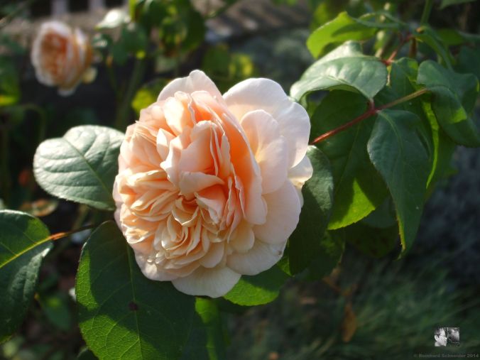 Sweet Juliet ist eine apricot farbene englische Strauchrose von Austin, die mir im letzten Jahr bei dem alljährlichen „Tag der offenen Tür“ der Bayrischen Landesanstalt für Weinbau und Gartenbau in Veitshöchheim besonders auffiel. Dort, auf dem Rosengelände, findet man die unterschiedlichsten Rosen der verschiedenen Züchter. Hier pflanzt man grundsätzlich 2 – 3 Exemplare der gleichen Art zusammen, um die Wirkung auf den Betrachter zu verstärken. Ein wunderbarer Duft, der mich dazu bewog, diese Rose zu kaufen. Nachdem die erste Rose gepflanzt war, den Winter gut überstanden hat und ordentlich austrieb, kaufte ich noch ein weiteres Exemplar. Der starke Duft erinnert an Teerosen, ein Dufterlebnis!