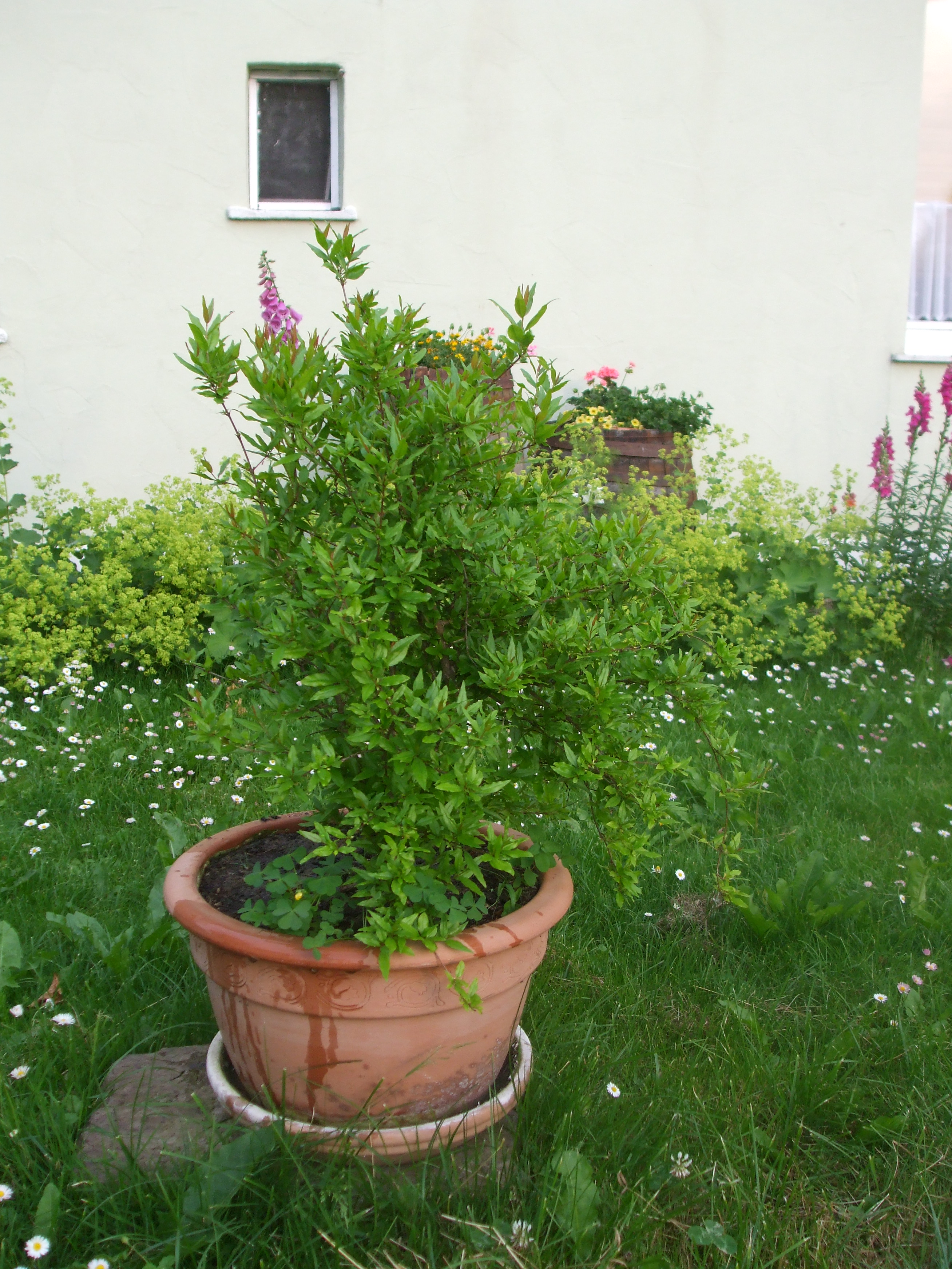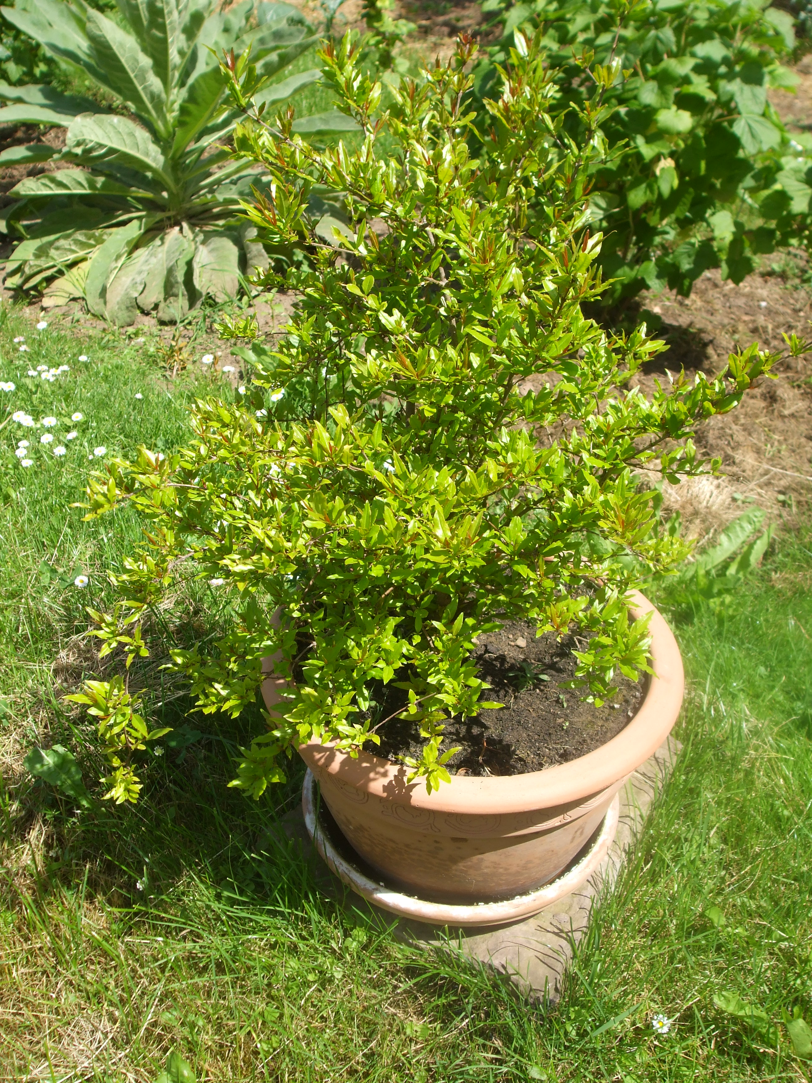 Die Granatapfelbäumchen haben wir quasi noch in Kinderschuhen bekommen. Nun sind sie schon im dritten Jahr bei uns. Wir ziehen sie als Strauch und haben bisher noch keine Blüte erlebt. Sie verlieren im Spätherbst ihre lanzettförmigen Blätter und überwintern in der Scheune. Der Blattaustrieb beginnt im Mai/Juni. Kleine rote Knötchen verraten den Beginn. Sie bevorzugen einen sonnigen Platz und sind unempfindlich und robust.