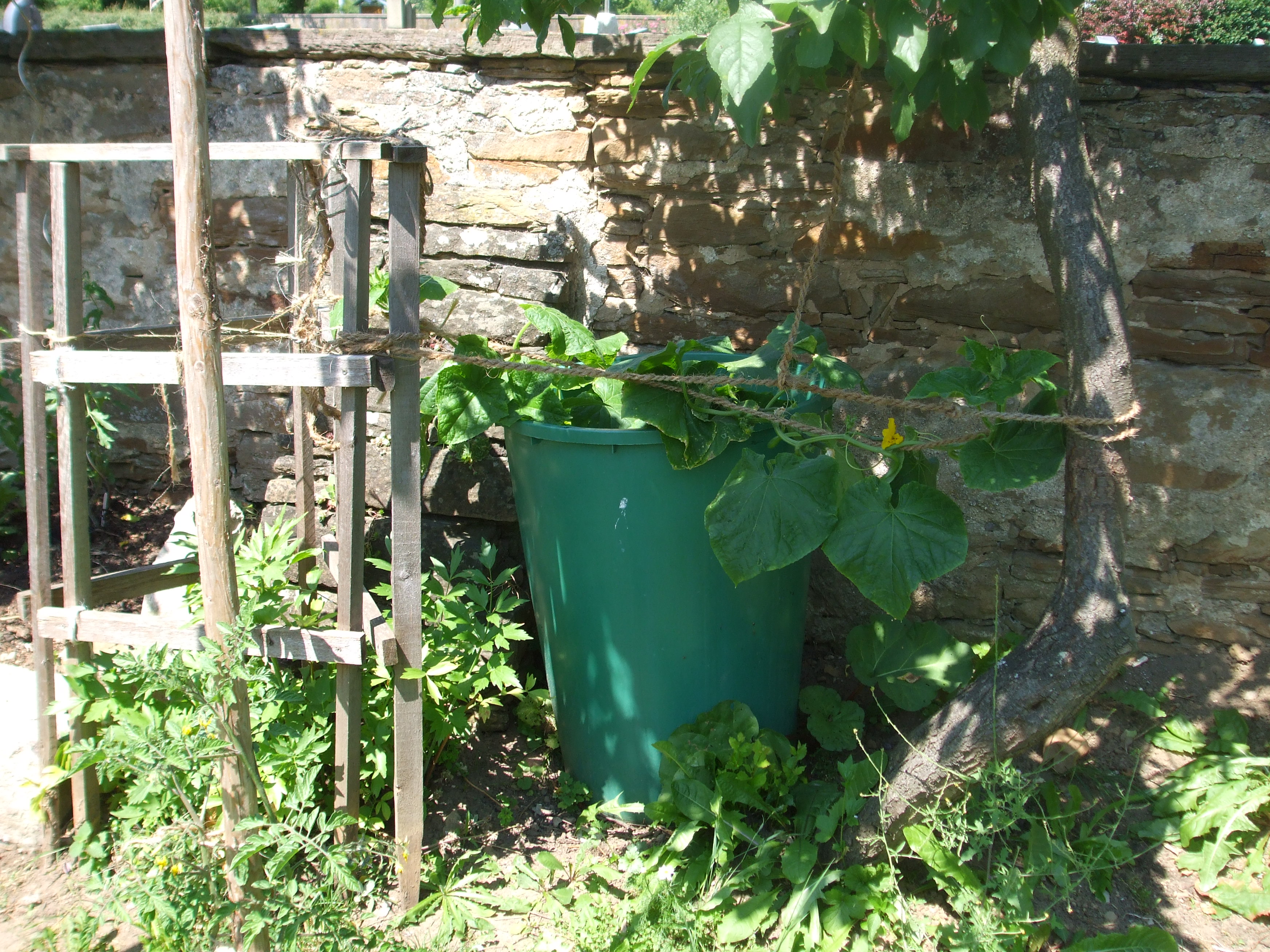 Ein altes undichtes Regenfass dient noch als Pflanzkübel für die Bauerngurken.
