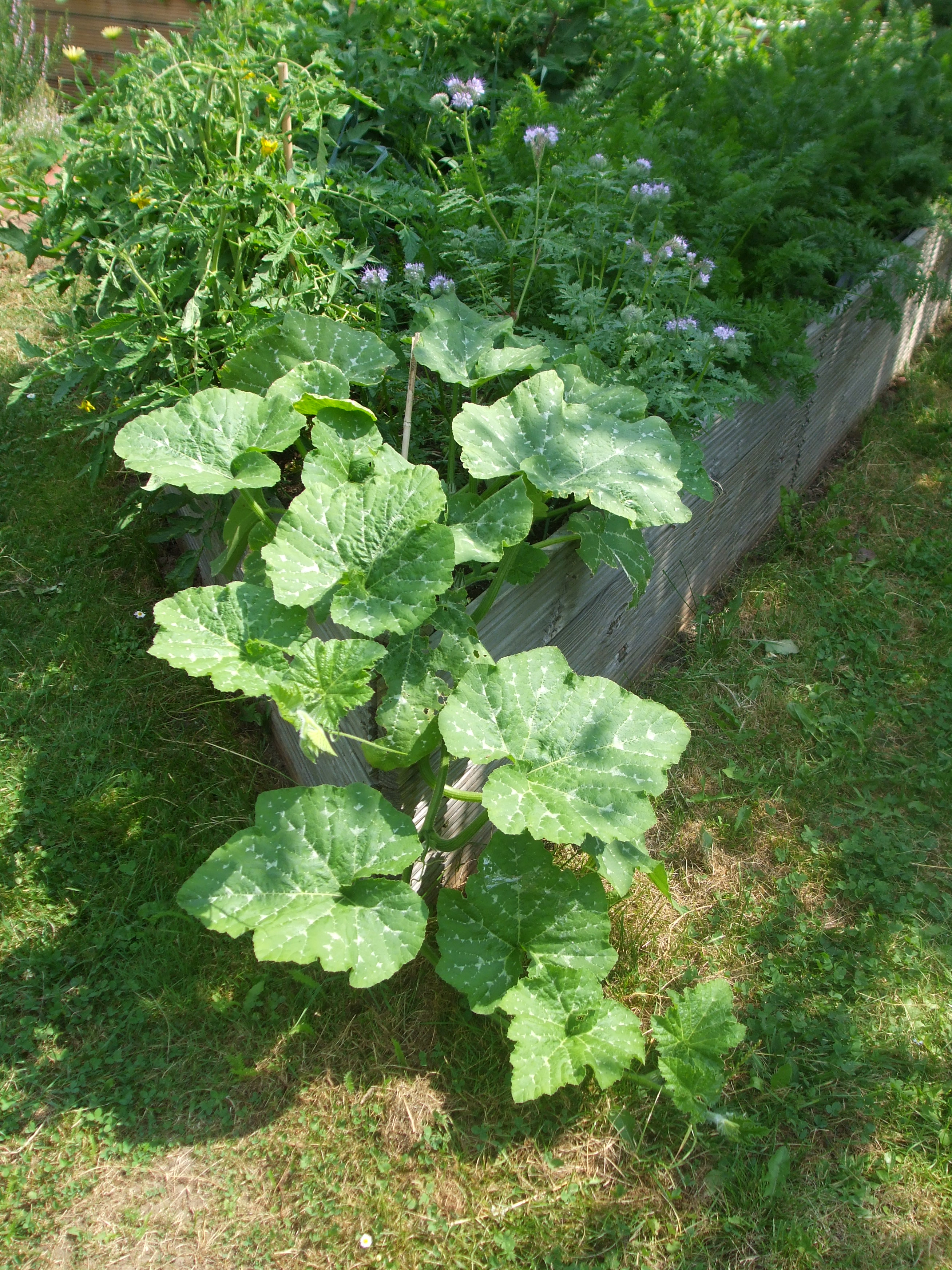 Der Muskatkürbis schmeckt hervorragend, er kann zwischen 3 – 5 kg auf die Waage bringen. Der Kürbis hat eine grünliche bis bräunlich-orange Schale, das Fruchtfleisch ist kräftig orange und schmeckt intensiv. Eine Pflanze kann 3-5 Exemplare hervorbringen. Bei uns krabbelt die eine Pflanze aus dem Hochbeet, eine weitere wächst noch auf dem Kohlbeet; sobald der Kohl abgeerntet wird, kann er sich auf den Weg machen.