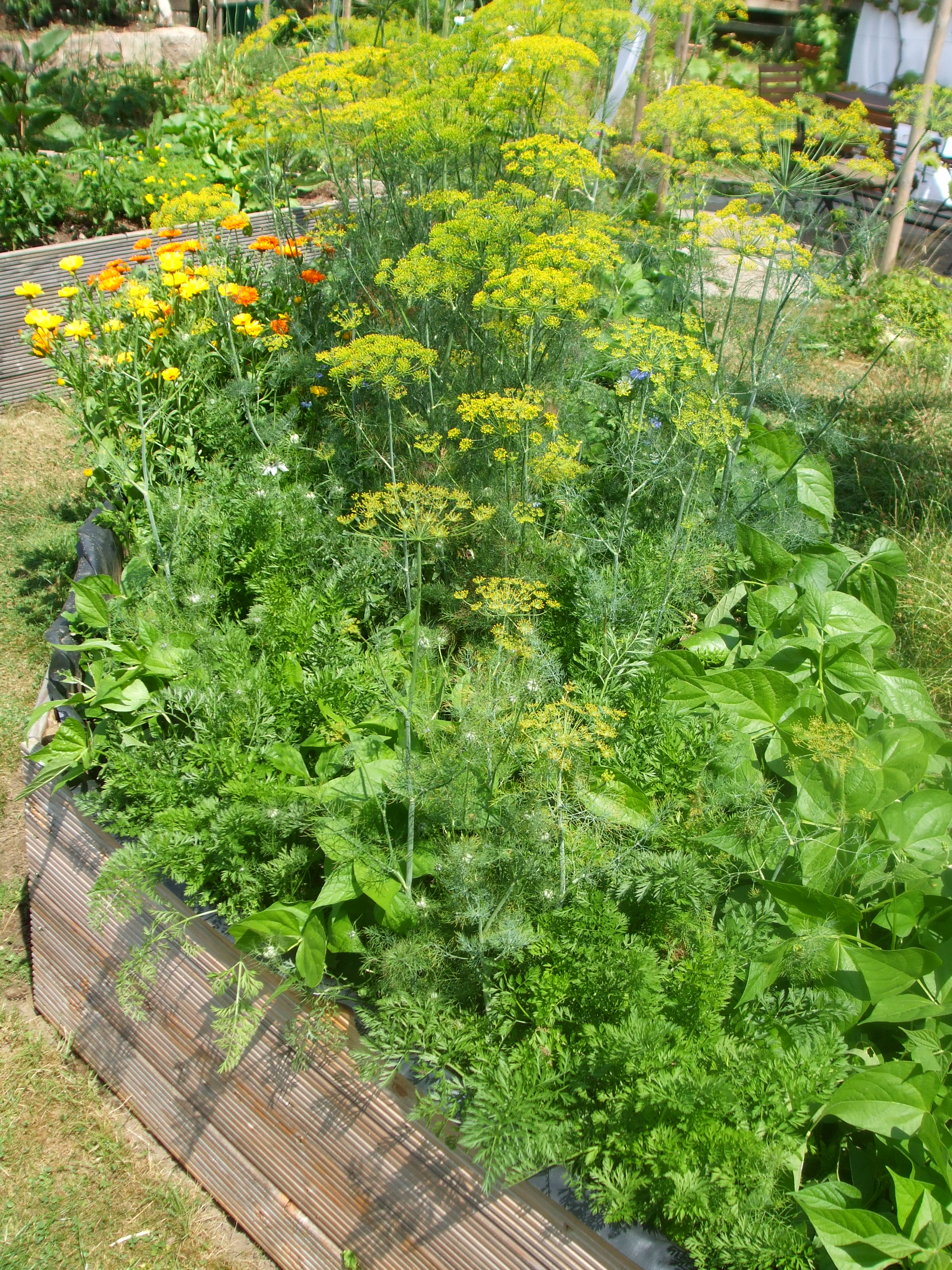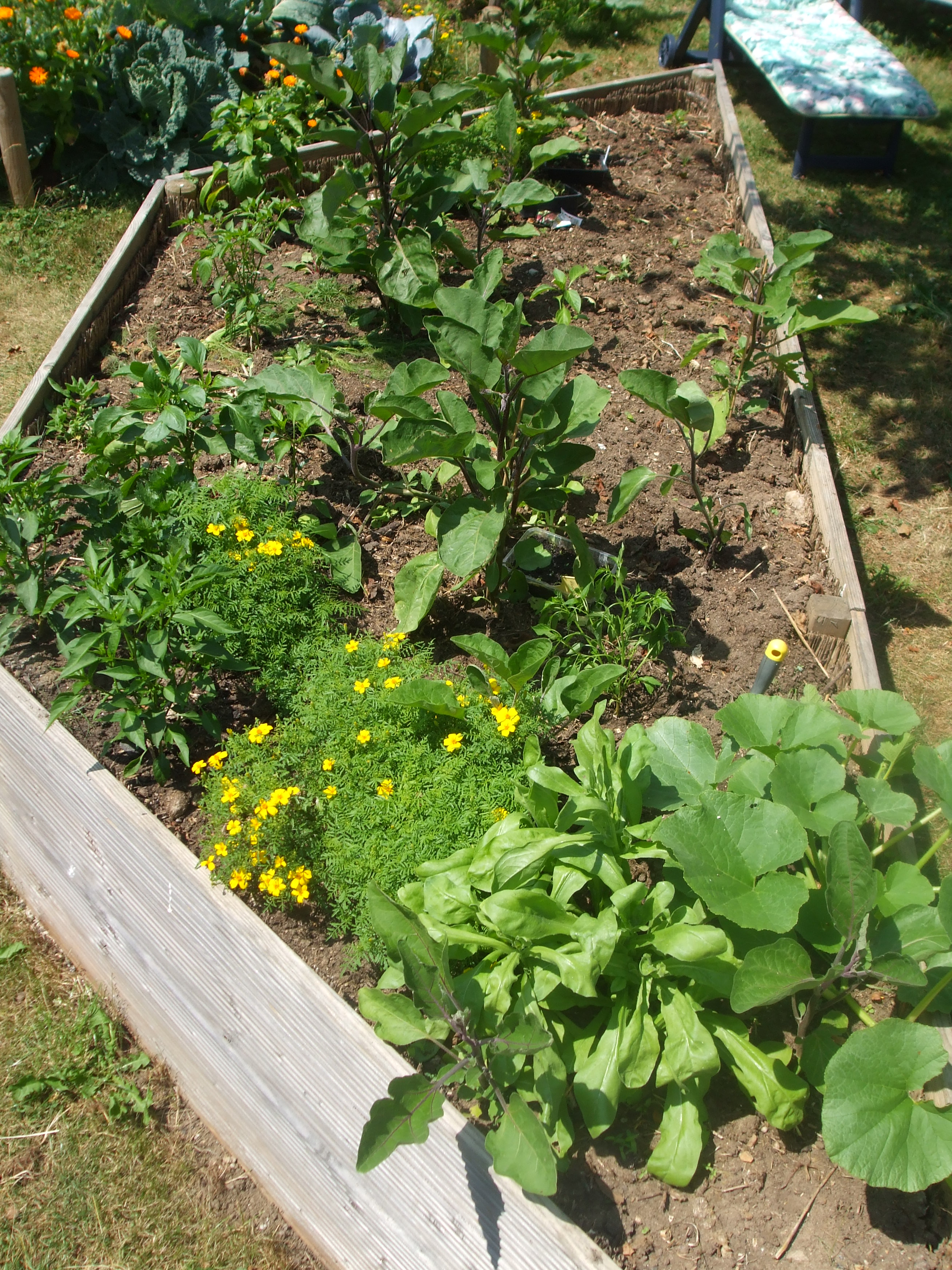 Kohlrabi, Salat und Zwiebeln haben wir bereits geerntet. Im Hochbeet mit den Auberginen und Paprika wächst jetzt der Neuseeländer Spinat heran. Nach einigen Wochen wird er das Hochbeet beranken. Bald wird der Sommersalat gepflanzt, der ist momentan noch zu klein und würde in der Wärme und ohne Regen vertrocknen. Auf dem Hügelbeet haben bereits 3 Köpfe Rotkohl und 2 Wirsingköpfe Platz gemacht für den heranwachsenden Kürbis.