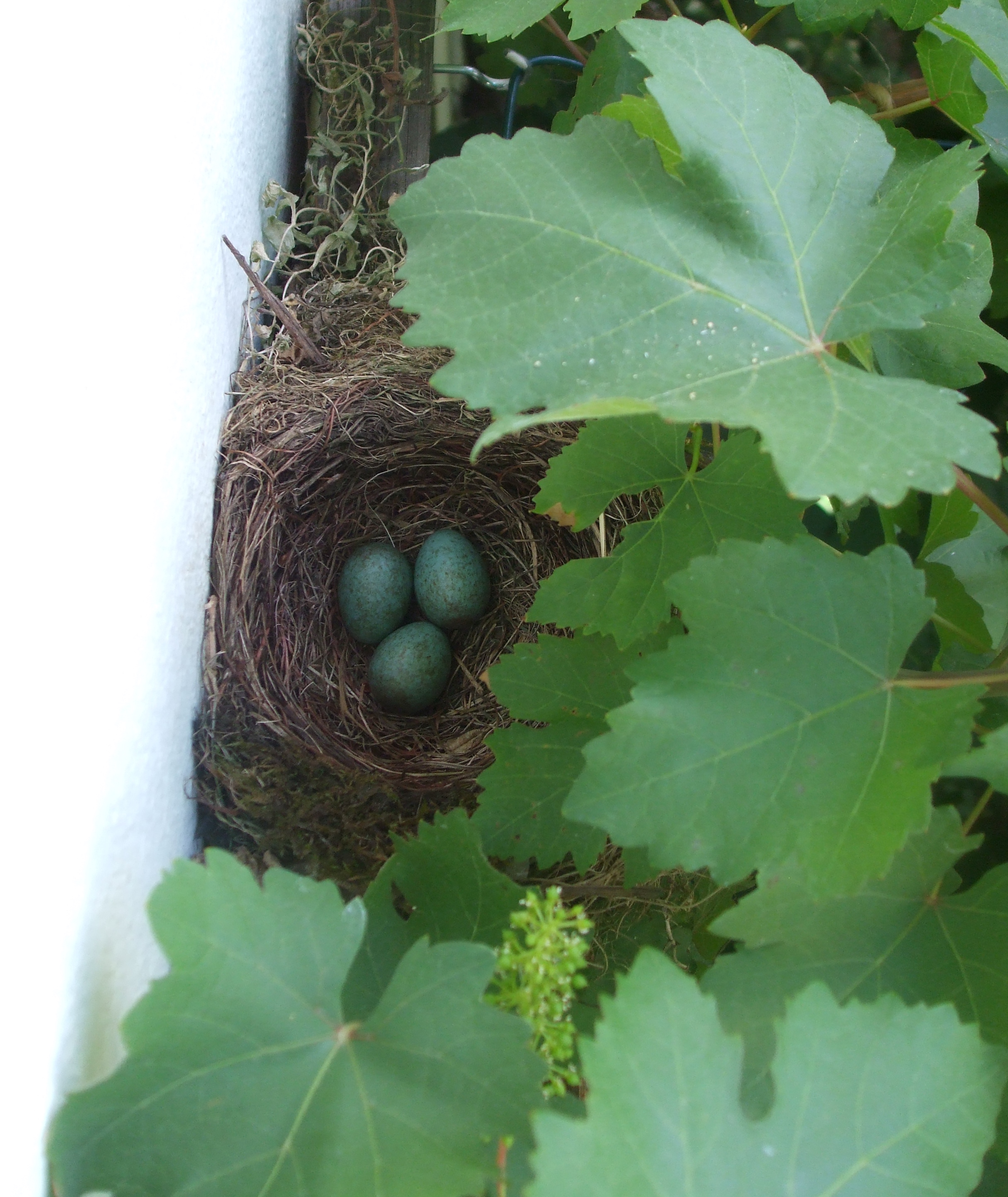 Schöne Sache, sind die Küken schon geschlüpft? Eine nahezu identische Situation habe ich auch in meinem Wein vorgefunden; ein Amselnest mit drei Eiern (auch dokumentiert unter http://vegetation-daheim.info/2013/06/24/amselnest-in-der-weinrebe/). Wie es scheint, ist allerdings nur ein Küken geschlüpft. Vom Fenster hat man eine recht gut Sicht. Es ist immer wieder spannend, zu sehen wie die Altvögel beim Anpeilen des Nestes versuchen, jegliche Aufmerksamkeit von sich abzulenken.