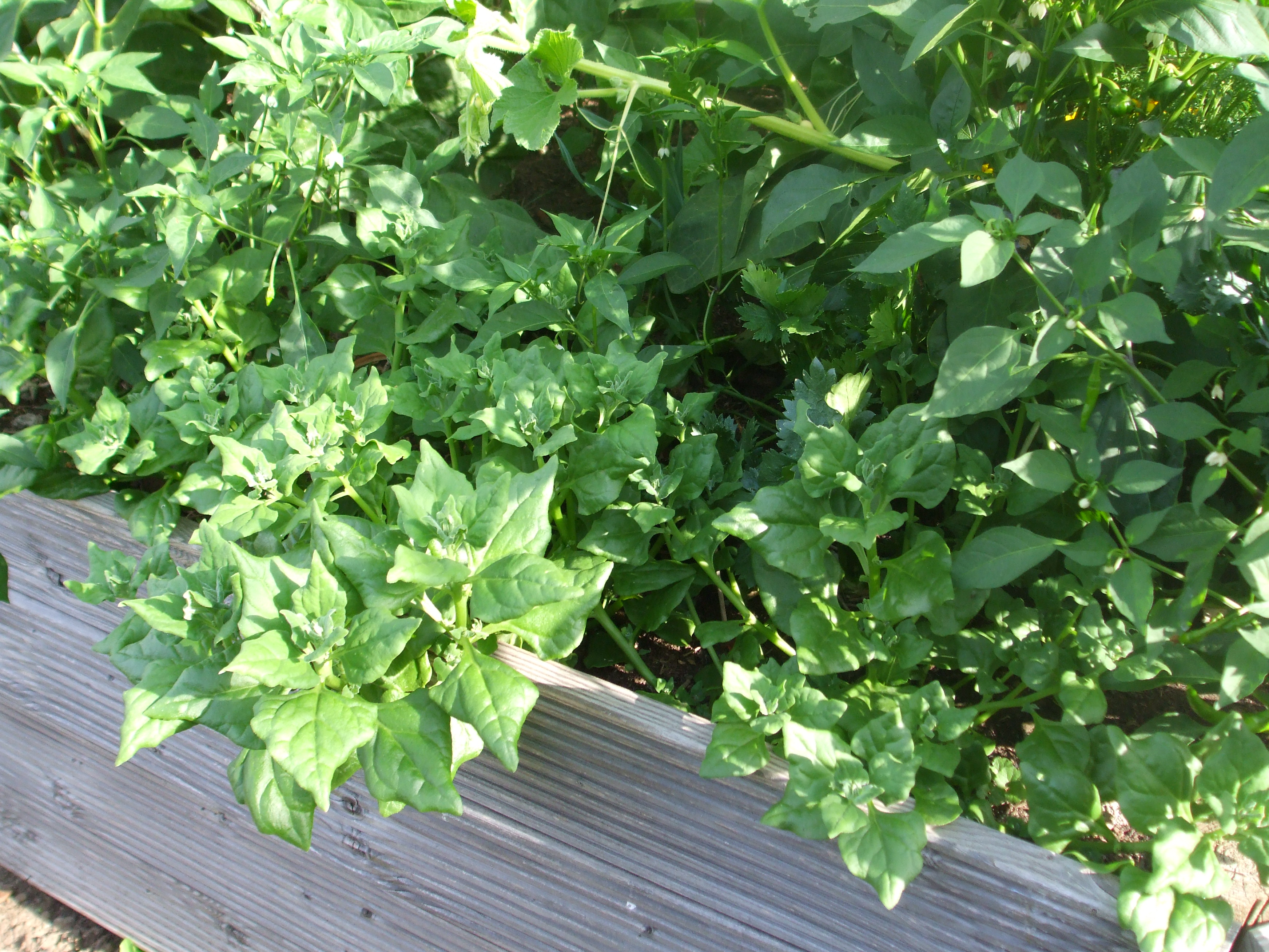 Zwischen den Pflanzen war noch ausreichend Platz für einige Knollensellerie. Die sorgten in der ersten Zeit für Beschattung der Freiflächen im Hochbeet. Für die Gesundheit des Bodens sorgen Tagetes und Ringelblumen. Schaut man auf die vordere Seite, entdeckt man jetzt den rankenden Neuseeländer Spinat. Immer wieder die Spitzen abzupfen – wie beim Basilikum – und er wuchert immer mehr.