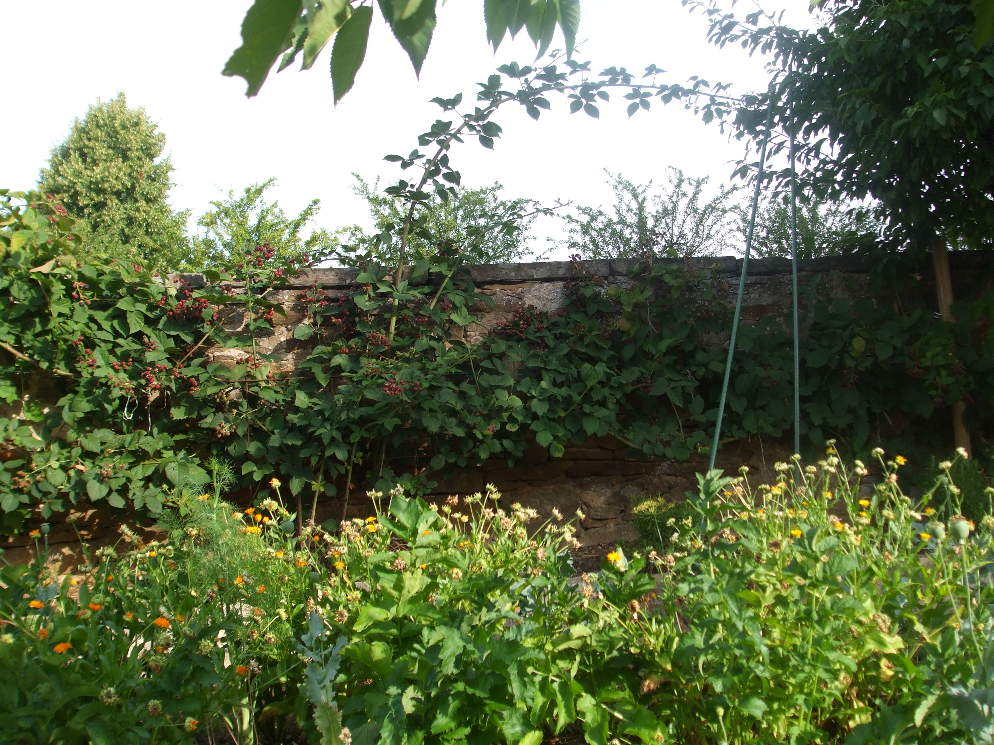 Die Brombeeren decken wir bei zu starker Sonne mit einem Flies ab. Die Sandsteinmauer speichert schon sehr viel Hitze, sodass die Brombeeren im vergangenen Jahr schier verbrannt sind!