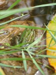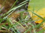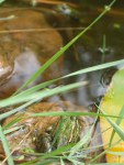 Bei unserem Besuch in Bamberg hatten wir Freunden unsere Lieblingsstaudengärtnerei „Bamberger Staudengarten“ (mit 10 ha Fläche) gezeigt. Hier entdeckten wir bei den Teichpflanzen auch ein großes Becken mit Fröschen. Da wir sie nicht einfangen konnten, holte eine der Gärtnerinnen einen Plastikbeutel und schaufelte etwas Froschlaich hinein. Diese kostbare Fracht schütteten wir in unseren Teich. Wochenlang beobachteten wir den Teich – erst heute entdeckten wir diese zwei Frösche!
