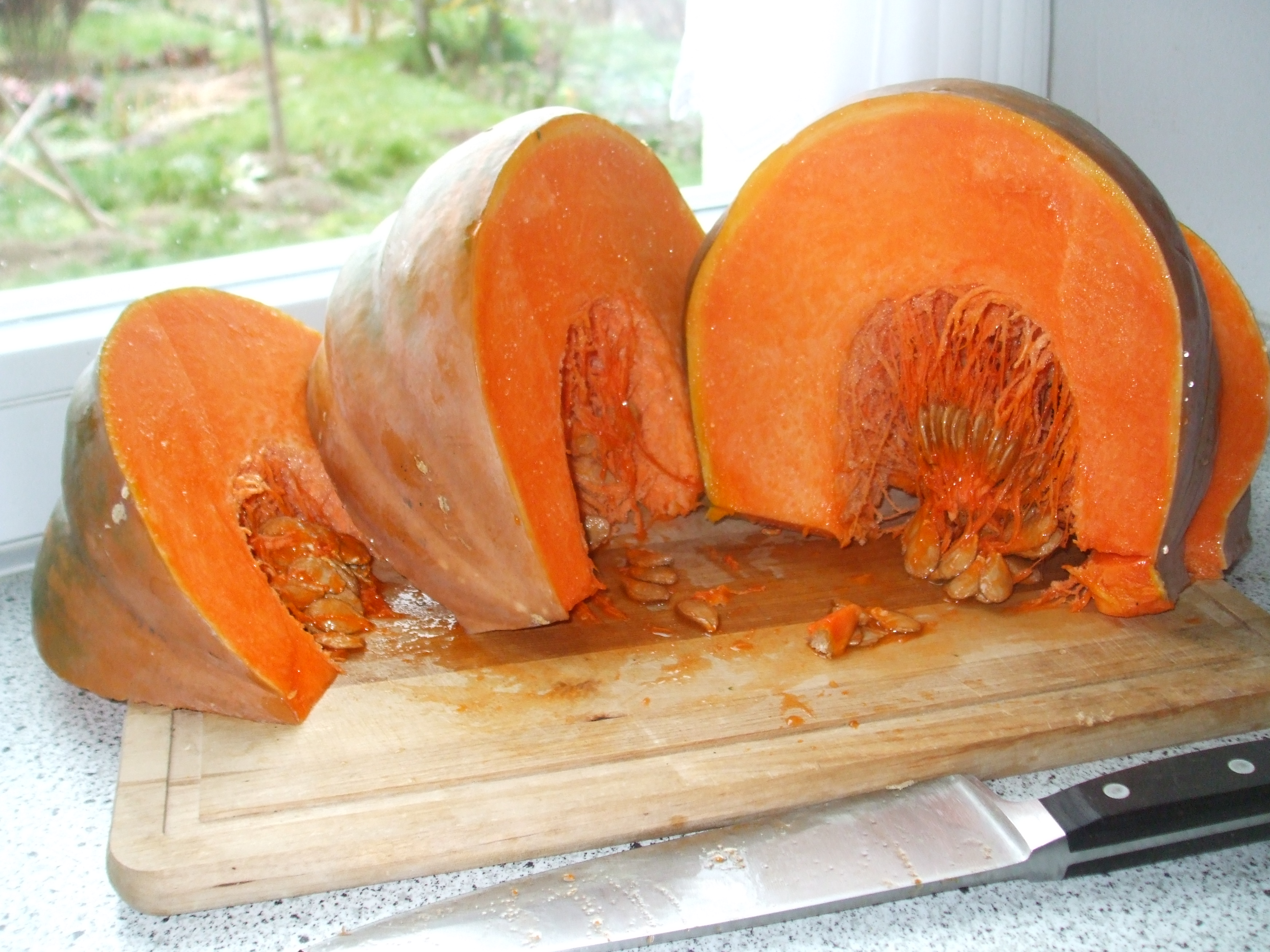 Im Garten ist es nass und kalt, daher beschäftige ich mich heute wieder mit dem leiblichen Wohl, dem Essen. Glücklicherweise mit Produkten aus dem eigenen Garten! Wir hatten zwei Muscat de Provence Kürbisse geerntet, zusammen brachten sie ca. 13,5 kg auf die Waage. Der kleine Nachkömmling ist nicht vollreif geworden, habe ihn aber trotzdem abgenommen, damit er bei dem Wetter nicht im Garten fault. Für mein Risotto nehme ich heute: