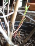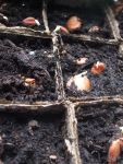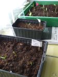 Wir haben uns heute mit unseren Aussaaten beschäftigt. Unterschiedliche Samen von Paprika und Auberginen hatte ich vor einiger Zeit schon ausgesät. Nach der Keimung im beheizten Zimmer habe ich sie gleich ins Kalte gestellt, damit sie keine „langen Hälse“ bekommen. Puffbohnen waren uns im letzten Jahr verfroren..in diesem Jahr haben wir sie einzeln in Töpfe gesteckt, bereits nach kurzer Zeit fingen sie an zu keimen. Der Estragon, eine französische Art, hat bei ca. 6-8° C einen frischen Austrieb. Ihn hatte ich im letzten Herbst getrocknet und genieße jetzt das unvergleichliche Aroma! Im Küchengarten zeigt der Mangold noch immer grüne Blätter..