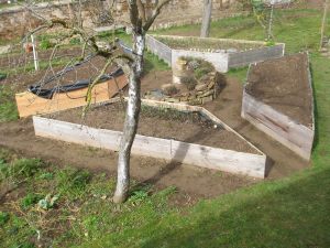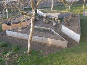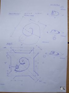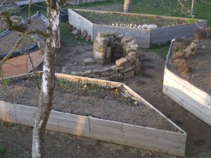 DSCF8053Nachdem die vier Hochbeete um unsere alte Kräuterschnecke fertig sind, haben wir uns inspirieren lassen von Christa Weinrich OSB und ihrem Buch „Geheimnisse aus dem Klostergarten“. Danach sollte die Kräuterschnecke einen Mindestdurchmesser von 2 m und einer Höhe von 80 cm haben. Diese Proportionen passen ideal zu den bestehenden Hochbeeten. Anhand einer Skizze machten wir uns noch einmal klar wie der Schatten über die Schnecke wandert. Die Form sollte einer richtigen Schneckenform entsprechen. Hierzu habe ich eine Maßskizze mit einem Raster gezeichnet, in dem das Grundmaß 40 cm ist. In Näherung an die Proportionen des goldenen Schnitts habe ich auf die Maßreihe von Fibunaci zurückgegriffen. Damit wächst die Schneckenform geradezu ideal. Als letztes vor der Umsetzung kam der Pflanzplan. Hier sollten verschiedene Böden den idealen Nährgrund für die Kräuter bilden. Magerer kalkhaltiger Boden für die mediterranen Kräuter wie Thymian, Salbei und Rosmarin an der Spitze, wo sie auch wenig Wasser erhalten. Am Fuß der Schnecke wachsen unser heimischen Kräuter wie Kerbel, Schnittlauch, aber auch Basilikum. Eine in den Boden eingelassenen Wanne sammelt im Sommer die Wärme des Tages und speichern sie für die Nacht. Das dadurch geschaffene Kleinklima ist ideal für die Kräuter.