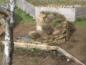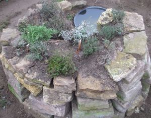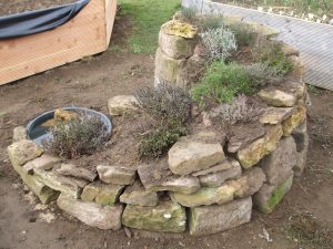 Zunächst wurde der Boden geebnet, die Form ausgemessen und mit Sand markiert. Jetzt wurden die behauenen Bruchsandsteine auf die Markierung gesetzt. Dann ist Phantasie und Vorstellungskraft gefragt. Die Steine müssen sorgsam ausgewählt werden, um das Zentrum der Schnecke bilden zu können. Dann wird, wie bei der Trockenmauer, Schicht auf Schicht aufgelegt. Dabei soll die Mauer eine leichte Neigung nach innen aufweisen. Dies erreiche ich durch den schrägen Anschnitt des Bodens für die erste Reihe. Die nächsten Reihen werden entlang des aus Stöcken markierten Höhenprofils gesetzt. Steht die Form der Schnecke, kann mit dem Auffüllen begonnen werden. Zunächst fülle ich ihn mit Bauschutt und Felsbrocken. Alte Dachpfannen als Speichen eingesetzt, helfen die Erde in dem starken Gefälle zu halten, speziell den Sandboden im oberen Bereich.Schließlich verteile ich die vorhandenen Kräuter neu und pflanze sie ein. Aus den vergangenen Jahren kenne ich die Wuchsform und Höhe und kann so darauf achten, das der Salbei oder Ysop nicht andere Kräuter in den Schatten stellen.