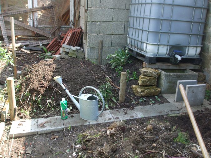 Die große Dachfläche unseres Anwesens sammelt den spärlichen Regen, der über verschieden Fallrohre abgeleitet wird. Ein Teil wird für den Teich genutzt, zwei Dachflächen füllen unsere Regenfässer. Wir hatten das meiste Regenwasser von der westlich ausgerichteten Dachfläche erwartet, hier hatten wir ein 1000 l Fass aufgestellt. Die Erfahrung zeigte jedoch, dass unser 300 l Fass von der nordöstlich ausgerichteten Dachfläche dauernd überlief. So entschlossen wir uns zum Tausch der Fässer. Dadurch mußte unsere bisherige Kompost-Ecke neu gestaltet werden. Bisher hatten wir Sammelbehälter aus gesteckten Brettern. Diese waren mit einer Kantenlänge von 80 cm jedoch zu klein um den Kompost richtig zu erhitzen. Das Kloster Fulda, Christa Weinreich OSB in „Geheimnisse aus dem Klostergarten“ und John Seymour in seinem Buch „Selbstversorgung aus dem Garten“ empfehlen eine Fläche von 2 x 1 m. Daneben sollte Platz sein für Sammelstellen von vertrockneten Stauden, altem Kompost und Mist. Zusammen mit frischem Grün soll jetzt im Mai der erste Kompost geschichtet werden und mit dem Kräuterpulver „Humofix“ zur heißen Kompostierung gebracht werden. Das Regenfass wiegt befüllt 1 t und ist zwischen diesen Haufen platziert. Da lag es nahe, ein stabiles Fundament aus einem Bordstein und Betonkübeln zu errichten, durch das das Fass für die Befüllung der Kannen in eine komfortable Höhe kommt.