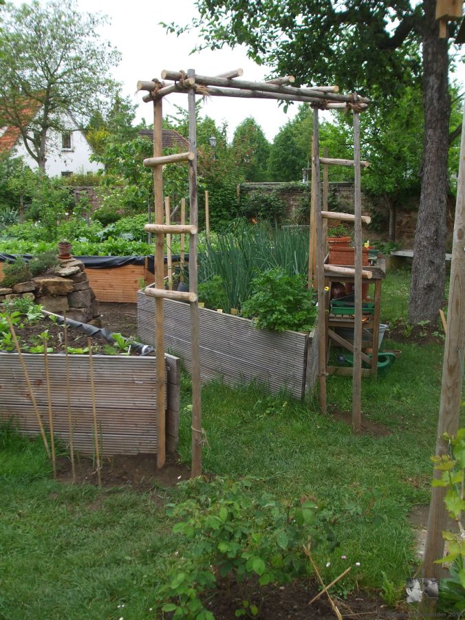 Lange hatten wir über verschiedene Lösungen der Rankhilfen nachgedacht und ausprobiert. Für die Rosen sollte ein einfaches, natürliches Material den Rosen nicht die Schau stehlen. So sind geschälte Fichtenstämme vom Sägewerk preiswert und passend um daraus Rankhilfen zu bauen. Dabei wurde auch ein einfacher Rosenbogen erstellt, der in der Sichtachse das Gartenzimmer Küchengarten abschließt. Die Gartenräume sollen, entlang der Sichtachse durch Tore, bzw. Rosenbogen betreten werden. Es wird also ein weiterer Bogen zur Straßenseite folgen und dann ein Durchschreiten der Gartenräume erlebbar machen. In unserem Garten sind natürliche Materialien verwendet. Für die Tomaten hatten wir bisher Metallspiralen, an denen die hochrankenden Sorten oft unter ihrem Gewicht abrutschten. Beim Besuch im Sägewerk fanden wir sägeraue Kanthölzer, die im Weinbau verwendet werden, gern aber auch für Tomaten genutzt werden. Eine preisgünstige Lösung, die zudem auch optisch besser zu unserem Garten passt.