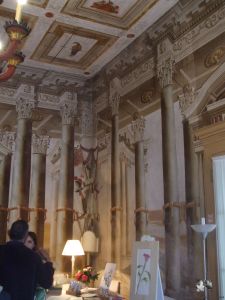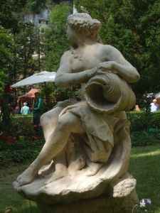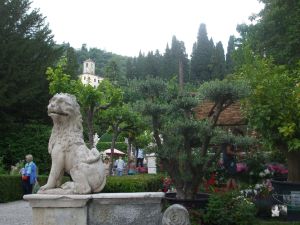 Der Garten der Villa da Schio in Costozza di Longare aus dem 16. Jahrhundert ist terrassenförmig angelegt und beherbergt auf den unterschiedlichen Ebenen drei Villen eines Baumeisters. Die oberste Villa erreicht man über die Zwergenstiege. Die Wände sind mit Temperafarben bemalt und die Decke ist mit natürlichem Grün bewachsen. Aus der Ecke gegenüber dem Fenster wächst ein Efeu dem Licht entgegen. Bereits in den 60er Jahren hat Queen Elizabeth die Villa besucht und war sehr beeindruckt. Bei unserem ersten Besuch in 2005 kamen wir in den Genuss einer persönlichen Führung des Hausherrn und seiner Mutter. Sie erzählte von einem natürlichen Höhlensystem, das noch heute für die Weinkellerei genutzt wird. Heute sind die jungen Damen des Hauses Initiatoren von Garten-Veranstaltungen und Hochzeitsfeierlichkeiten in der Villa.