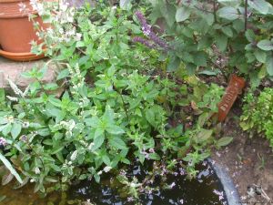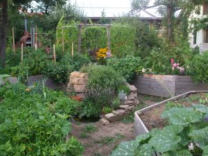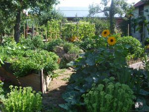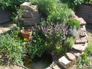 Die Kräuter, die einen frischen Boden benötigen, wie z. B. Petersilie, Pimpinelle und Schnittlauch haben ihren Platz im Halbschatten. Dill wächst in den Hochbeeten zwischen den Gemüsen, der Borretsch sät sich auf den Wegen aus….