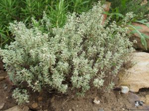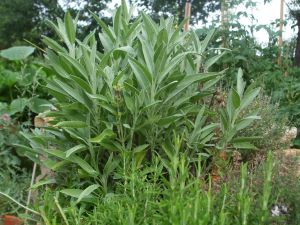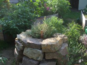 Der Mittelpunkt im Küchengarten ist die Kräuterschnecke, die wir erst im Frühjahr vergrößert hatten. Die Kräuter bekamen einen kräftigen Rückschnitt, dass sie besser einwachsen konnten. Inzwischen hat es zwar lange, trockene Phasen gegeben, in denen wir tüchtig gießen mussten – jetzt, nach einigen Regengüssen wachsen sie wieder schön kompakt und buschig. Vor einigen Tagen haben wir noch den Beifuß / Artemisia vulgaris dazu gesetzt