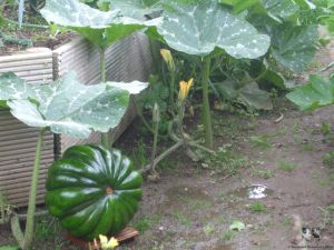 Die Reben in tiefem Blau brauchen noch einige Zeit zu reifen. Kürbisse Hokkaido und Muscat de Provence legen ordentlich zu! Ein kleines Holzbrettchen als Unterlage verhindert Fäulnis. Auberginen, Tomaten, Paprika, Gurken, Zucchini, Buschbohnen und Feuerbohnen und Neuseeländer Spinat werden laufend geerntet und gleich verarbeitet. Nachdem der Kohl jetzt viel Regen bekommen hat, ist er auch recht tüchtig gewachsen.