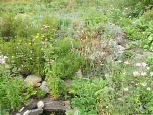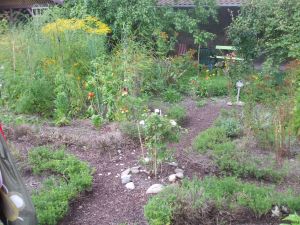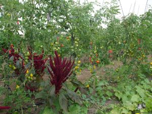 So folgte das Auditorium wissenshungrig zum nächsten „Garten“ hier wuchsen Erdbeeren, es ging weiter an der Kräuterschnecke vorbei zum Tomatenfeld, dass ohne Überdachung auch die herrlichsten Früchte trug. Dazwischen immer Kräuter wie Salbei, Bohnenkraut, reichlich Amaranth in allen Schattierungen, besonders die dunkelroten Blüten waren auffallend.