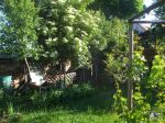 Der älteste Holunder war als Baum gezogen, eine Wuchsform, wie bei allen Obstgehölzen. Hatte früher der Verbiss durch die Tiere in Wald und Feld dafür gesorgt, dass der Stamm in die Höhe wuchs so kann dies heute der Gärtner durch gezielten Schnitt der unteren Austriebe tun. Da wo dieser Verbiss oder Beschnitt fehlt werden Obst- und Holunderpflanzen zu Sträuchern, ähnlich wie bei der Rose der Strauch oder die Hochstammrose. In diesem Jahr reichte zur Ernte die Leiter schon nicht mehr aus, so dass ein kräftiger Rückschnitt vorgenommen wurde. Dies regt, wie bei Obst- und Beeren und Rosen das Wachstum an, – bei Zwetschgen sollte man davon absehen, da diese zu stark nachwachsen.