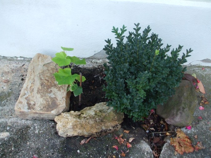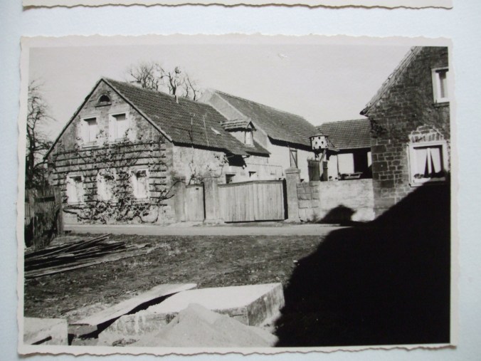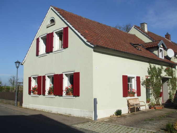 Wir erinnerten uns an das alte Bild vom Haus, auf dem an der Straßenseite, die nach Süden zeigt, ein großer Weinstock, im Kordon erzogen, zu sehen ist. Damals war der öffentliche Weg am Haus noch nicht geteert. Das Loch im Beton der Einfahrt hatte ich für den Buchs recht groß ausgestemmt, so dass später eine Rebe noch Platz hätte. Jetzt ist es soweit, das wir der Hausfront wieder sein, für die Landschaft typisches, Gesicht geben können.