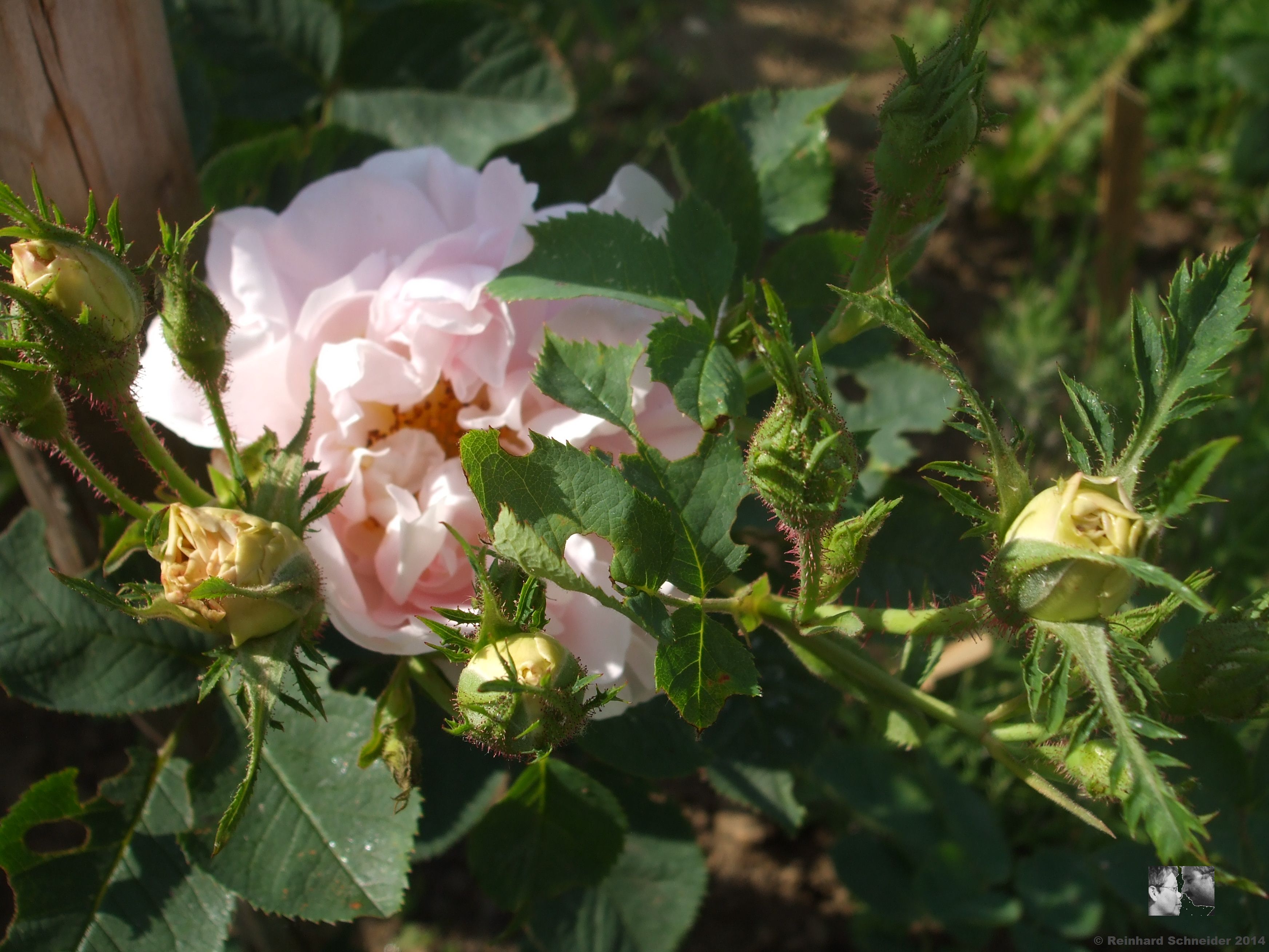 Eine von John Booth um 1816 gezogene Alba-Rose oder eine Alba-Hybride mit einer Damaszener-Rose. Die ausladenden Triebe mit bis zu 2 m Höhe sind recht weich und mit zahlreichen weichen Stacheln bedeckt. Die Blätter sind bläulich-grün und dunkler als die der meisten Alba-Rosen. Die Blüten sind blassrosa, dicht gefüllt und mit gevierteltem Grund. Sie haben einen typischen, süßen Damaszenerduft. Sie soll eine der besten Gartenrosen sein mit dichten, gefüllten Blüten. Sie sind bis – 34°C winterhart. Pflanzjahr 2013.
