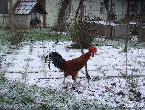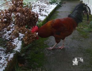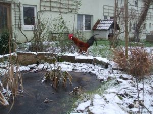 Heute konnten sie schon einmal einen Gang nach draußen machen, der Zaun ist wegen des Wetters noch nicht eingesetzt, aber unter Beaufsichtigung konnten sie sich erst einmal umschauen und ein wenig im Garten picken. Zuerst ging Caruso hinaus, um die Lage zu inspizieren. Dann tauchte Sabinchen auf und zum Schluss erschienen Berta und Emma.