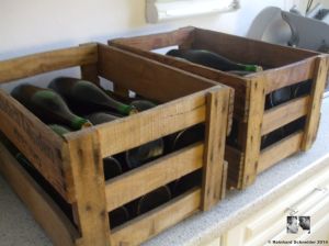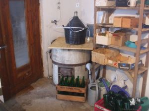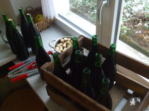 Nun, heute fing es am Vormittag an zu schneien. Wir hatten heute in Volkach Weinkisten besorgt und haben uns entschieden, unseren Rotwein endlich abzufüllen. Die Korken waren schon seit gestern eingeweicht und nun brauchten wir nur den Wein in die gesäuberten Flaschen zu füllen und sie zu verkorken.