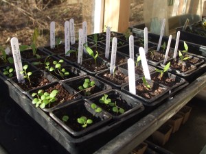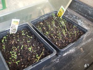 Das Gewächshaus ist gut belegt! Trotz niedriger Temperaturen halten sich die Keim- und Setzlinge wacker. Nachts decke ich sie sicherheitshalber noch mit Styropor ab. Am Boden habe ich bisher nur Hirschzungen-Salat gesät.