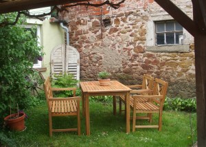 Auch im Hof haben wir in der Weinlaube, die gleichzeitig auch unseren Schattengarten beherbergt, eine gemütliche Sitzecke. Im Hochsommer kann man es hier im Schatten des Weinlaubes gut aushalten. Hosta, Astilbe und Geißblatt breiten sich hier aus…