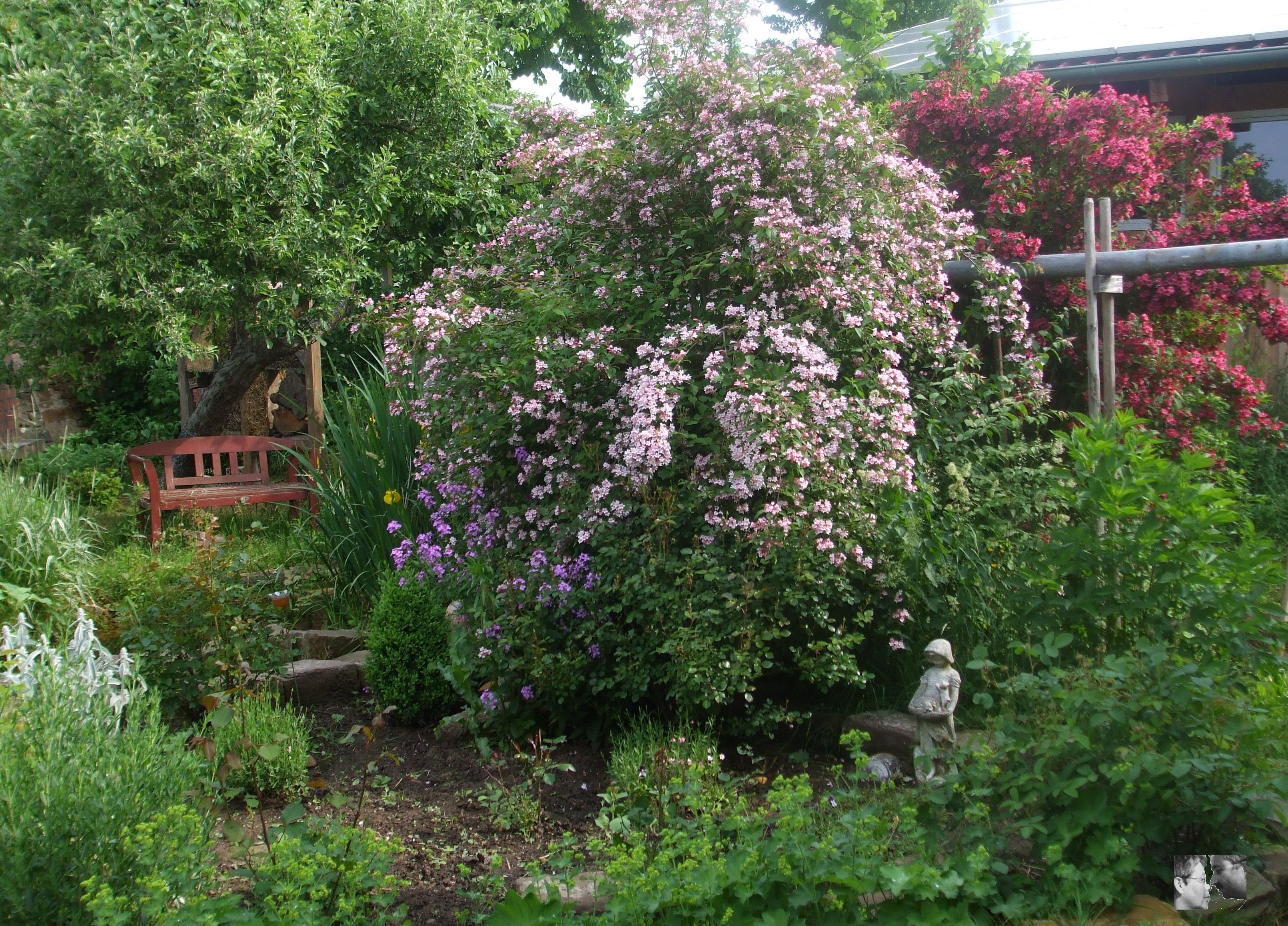 Am hinteren Ende des Gartens bildet eine Reihe von Ziergehölzen eine natürliche Grenze. Der Teichgarten und auch der Rosengarten bekommen so einen schönen Hintergrund. Gleichzeitig bieten sie der Fauna eine Nahrungsquelle sowie schützenden Unterschlupf.
