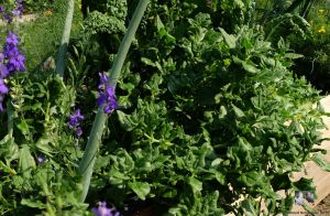 Ernten konnten wir bisher die Erbsen ‚Kleine Rheinländerin‘, Erdbeeren, rote und schwarze Johannisbeeren, Josta-Beeren, Stachelbeeren und laufend Neuseeländer Spinat, Kohlraben, Salate und natürlich Kräuter wie Schnittlauch, Petersilie, Thymian in Sorten – nicht zu vergessen die verschiedenen Minzen!