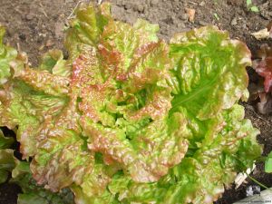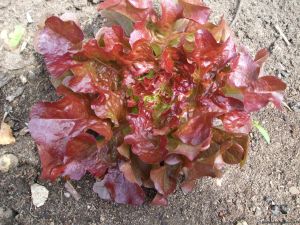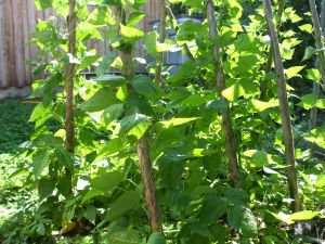 Zwischen den Stangenbohnen Salate zu ziehen, hat sich in diesem Jahr nicht sonderlich bewährt – Schnecken haben sich über den wunderbaren Hirschzungensalat hergemacht. Erst wollte er nicht wachsen und nach einem Tag Regen lockte er die Schnecken vom Nachbargrundstück. Jetzt haben wir aktuell den roten Eichblattsalat, den sie scheinbar nicht mögen.