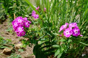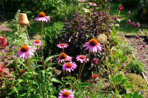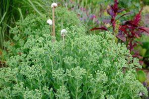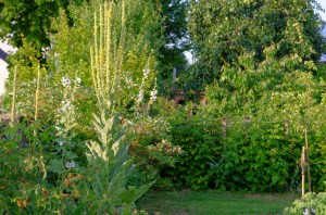 In diesem Jahr haben wir sehr viele Verbascum olympicum, imposant setzen sich sich ins Bild. Inzwischen achten wir im Frühjahr darauf, dass wir sie rechtzeitig verpflanzen, wenn sie sich einen ungünstigen Platz ausgesucht haben. Auch Eupatorium rugosum ‚Chocolate‘ mit dem dunklen, an Schokolade erinnerndes Blattwerk, gefällt mir gut zu den Echinacea purpurea. Natürlich darf auch Sedum telephium nicht fehlen, ein Insektenmagnet bis in den späten Herbst hinein.