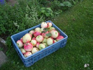 4. Meine Ernte war in diesem Jahr ganz merkwürdig. Die Gurken kamen gar nicht, ebenso die Tomaten. Ich hatte eine schwarze und eine gelbe Sorte gezogen, die zunächst gut kamen, dann aber eingegangen sind, als sie in voller Frucht standen und die Pfirsiche sind alle abgefallen. ABER! Die Bohnen sind reichlich (das gibt einen Bohnenwinter), mit Mangold könnte ich tapezieren und mit den Äpfeln könnte ich den Markt beliefern. Nach der Zucchinischwemme im vergangenen Jahr, haben wir in diesem Jahr nur 2 Sorten angepflanzt. Das war allerdings zu wenig.