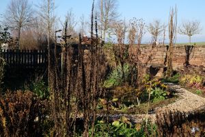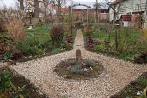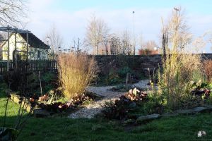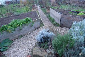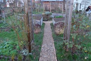 Die Temperaturen sind geradezu ideal, noch etwas an den Kieswegen im Garten zu arbeiten. Das Wegekreuz im Staudengarten ist im Oktober fertiggemacht worden und jetzt soll es weitergehen. Die feuchte Erde lässt sich jetzt gut herausheben, wir füllen damit die Hochbeete auf und mit den Grassoden decken wir den Kompost ab. Wir schottern den Untergrund mit vorhandenen Ziegeln und Bauschutt. Der Flusskies reicht leider nicht, aber zum Teichbau im März wird neuer Kies geliefert – dann geht es weiter!