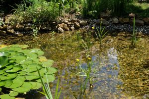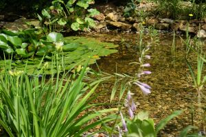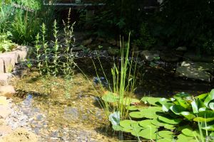 Im Teich selbst haben sich Ranunculus lingua, der Zungen-Hahnenfuss, Menyanthes trifoliata, der Fieberklee, Stratiotes aloides, die Krebsschere und Lysimachia thysiflora, der selten gewordene Straußblütige Gilbweiderich, Pontedaria cordata, das Hechtkraut, die verschiedenen Lythrum salicaria , Blutweiderich zu Seerose und Caltha palustris, der Sumpfdotterblume gesellt. Verschiedene Iris wie Iris versicolor in Sorten, Iris fulva, Iris laevigata und Iris Clyde Redmond, die Louisiana -Iris, runden das Bild ab. Noch haben nicht alle geblüht, aber die Hauptsache ist, dass sie alle gut angewachsen sind.