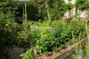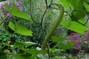 Der Gemüsegarten zeigt sich von seiner besten Seite …..die letzten Johannisbeeren sind gepflückt. Blumenkohl und Weißkohl habe ich geerntet und eingefroren.  Eine kletternde Zucchini hatte ich zusätzlich ausgesät ‚Trombetta d’Albenga‘. So jung wie auf dem Foto kann man sie bereits zubereiten. Lässt man sie später ausreifen, verwendet man sie wie Kürbis.  Der Dill hat sich in diesem Jahr einen besonderen Platz gesucht: an der Williamsbirne 😉  Die historischen Tomatensorten haben sich prächtig entwickelt und erste Früchte konnte ich gestern ernten. Darüber werde ich in den nächsten Wochen noch berichten.