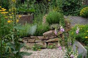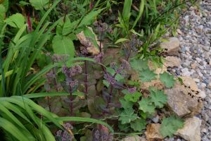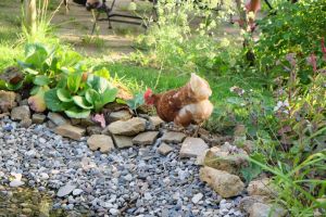 Am Teich vergnügen sich die Vögel und manchmal sogar unsere Hühner 😉                         Die Bepflanzungen am Teichrand haben sich gut entwickelt. Ab und zu gibt es eine Kanne Wasser – im Pflanzjahr brauchen sie das, später müssen sie nur mit der Bodenfeuchtigkeit zurechtkommen.