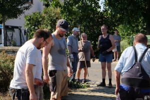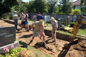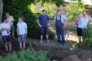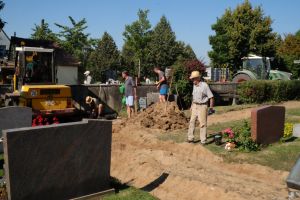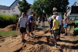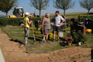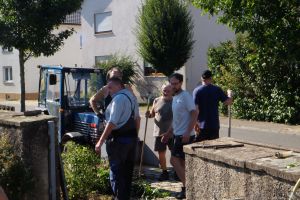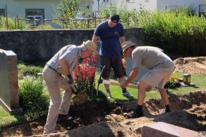 Seit einiger Zeit ist der Fußweg im Friedhof in einem schlechten Zustand. Bei 37° C trafen sich heute Hainerter Bürger und begannen mit der Instandsetzung in Eigenleistung. Die Materialien werden von der Gemeinde Knetzgau gestellt.