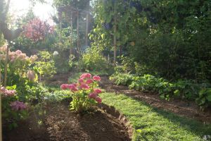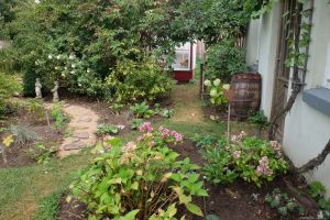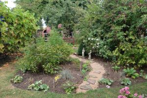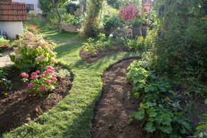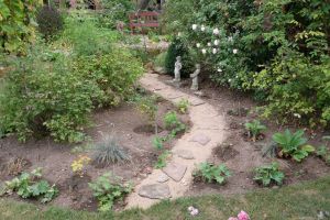 Bisher waren die historischen Rosen in einem Beet links und rechts des Sitzplatzes und ein weiteres im Rücken des Sitzplatzes positioniert Die Neugestaltung sollte die Beete in Form und Größe harmonisch verändern. Wir verbreiterten die Kanten so, dass jetzt eine größere Fläche entstand. Schmale Pfade ermöglichen jetzt den Zugang zu allen Rosen und damit auch eine leichtere Pflege.