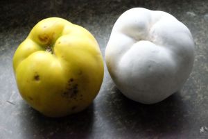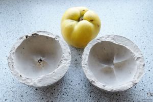 Eine schöne Dekoration für die Wohnung sind Gipsabgüsse von Obst und Gemüse. Wir tauchen z.B. eine Quitte in eine Kunststoffschale mit Gips. Dadurch wird die eine Hälfte der Quitte abgeformt. Nach dem Abbinden des Gips am nächsten Tag wird die Quitte aus der Form entnommen. Als Trennmittel sprühen wir die Kontaktfläche der Form mit einer wässrigen Pottasche-Lösung ein und führen das Abgießen mit der anderen Hälfte durch.