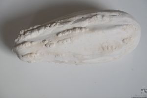 Nach dem Abbinden des Gips entnehmen wir die entstandene Gussform aus der Kunststoffschale. An der Naht der beiden Hälften trennen wir diese vorsichtig mit einem Spachtel voneinander. Nun erfolgt das Ausgießen der beiden Hälften mit Gips. Die richtige Position der Schalen zueinander markieren wir mit einem Stift.  Die Gusshälften werden zunächst mit der Pottaschelösung eingesprüht.  Nun wird der Gips in die Hälfte gegossen. Solange der Gips noch feucht ist, können die Hälften aufeinandergedrückt werden. Am nächsten Tag drücken wir die Schalen mit einem Spachtel auseinander.  Nun kann die Gipsquitte trocknen. Durch Abschleifen mit feinem Schleifpapier erhält der Abguss seine feine Oberfläche.