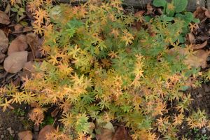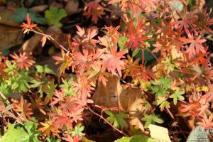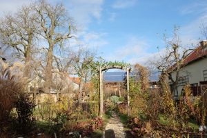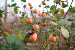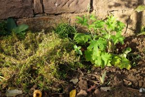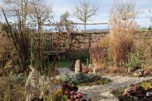 Die milden Temperaturen und die Feuchtigkeit lassen einige Stauden wieder wachsen. Farbe bringen hier auch kleine Stauden wie z.B.  Geranium sanguineum var. striatum und die weiße Schwester ‚Album‘ oder auch kleine Ziergräser und Hagebutten.