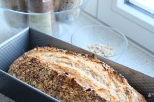Ich backe momentan mit Hefe, etwa 20 Gramm auf ein Kilo Mehl. Beim Mehl mische ich Weizenmehl Typ 550 und Weizenvollkornmehl und meist auch 100-200 g Hartweizengrieß, alles zusammen um ein Kilogramm. Hefe wird mit Wasser und einer Prise Zucker angerührt und ruht etwa 10 Minuten. Zum Mehl füge ich noch 1-2 TL Salz und Körner und Gewürze nach Wahl hinzu. In eine tiefe Kuhle gieße ich dann die Hefe und knete alles zusammen mit etwa 700 ml Wasser. Nach etwa 10 Minuten kommt der Teig in eine Glasschüssel, wird abgedeckt und ins Kalte gestellt. Bei mir ist es der Vorrat mit aktuell 10-12°. Dort hat der Teig eine 12 stündige Nachtgare…